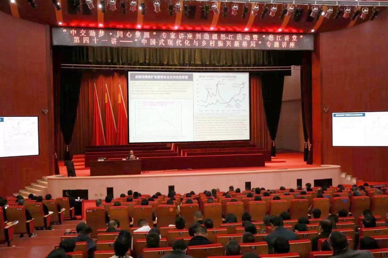 温铁军以《中国式现代化与乡村振兴新格局》为题,结合党的二十大精神和国家乡村振兴战略进行专题授课,受到与会者一致好评和热烈反响。怒江州领导,州委州政府相关单位负责同志,各县(市)、乡镇(街道)有关同志共计1200余人聆听了讲座。