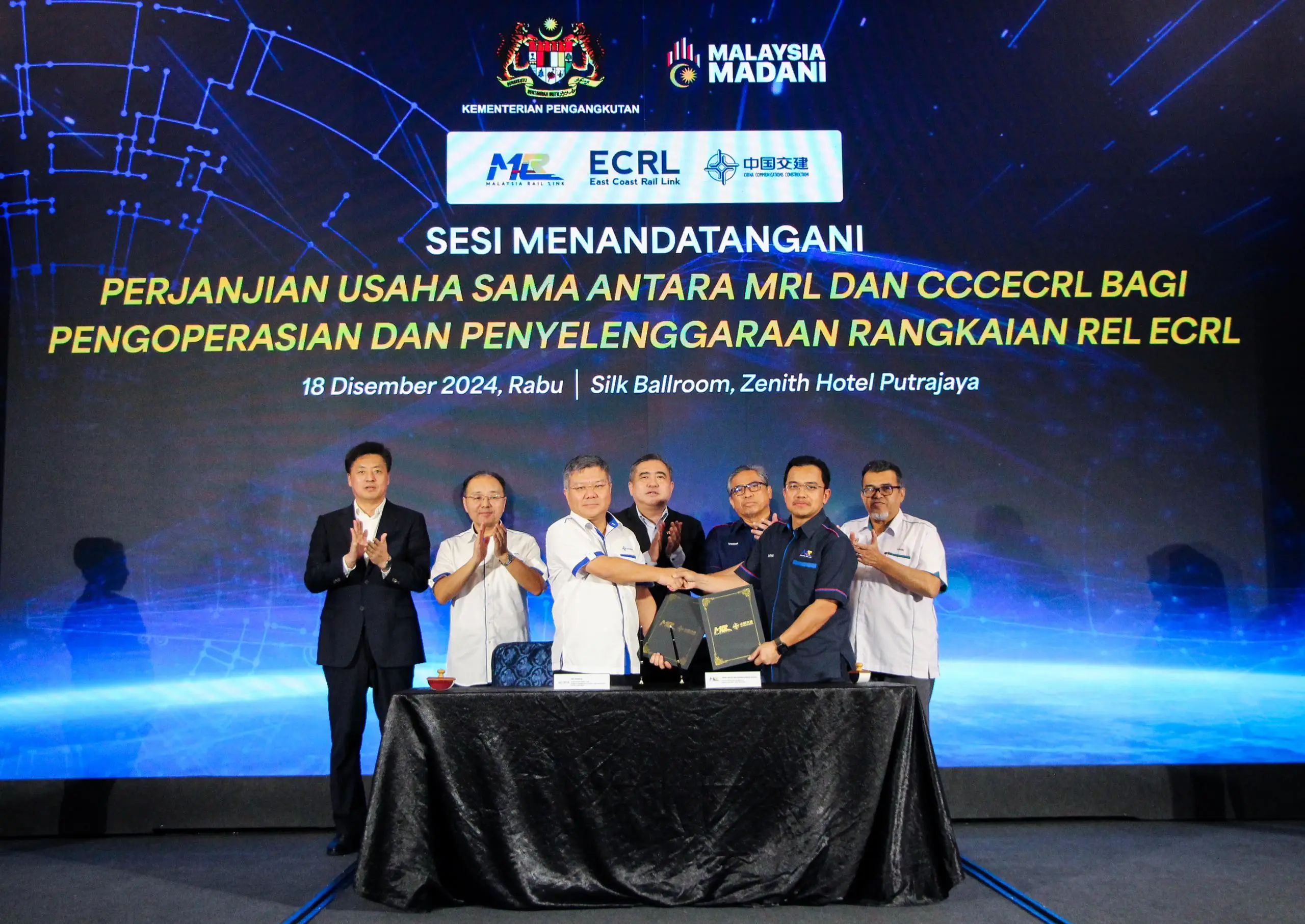12月18日,马来西亚东海岸铁路项目联合运维协议签署仪式在马来西亚行政首都布城举行。中国驻马来西亚大使欧阳玉靖,马来西亚交通部部长陆兆福、政府首席秘书丹斯里三苏·阿兹里、交通部副部长拿督哈斯比·哈比波拉,马来西亚铁路衔接公司首席执行官拿督斯里达维斯出席仪式。