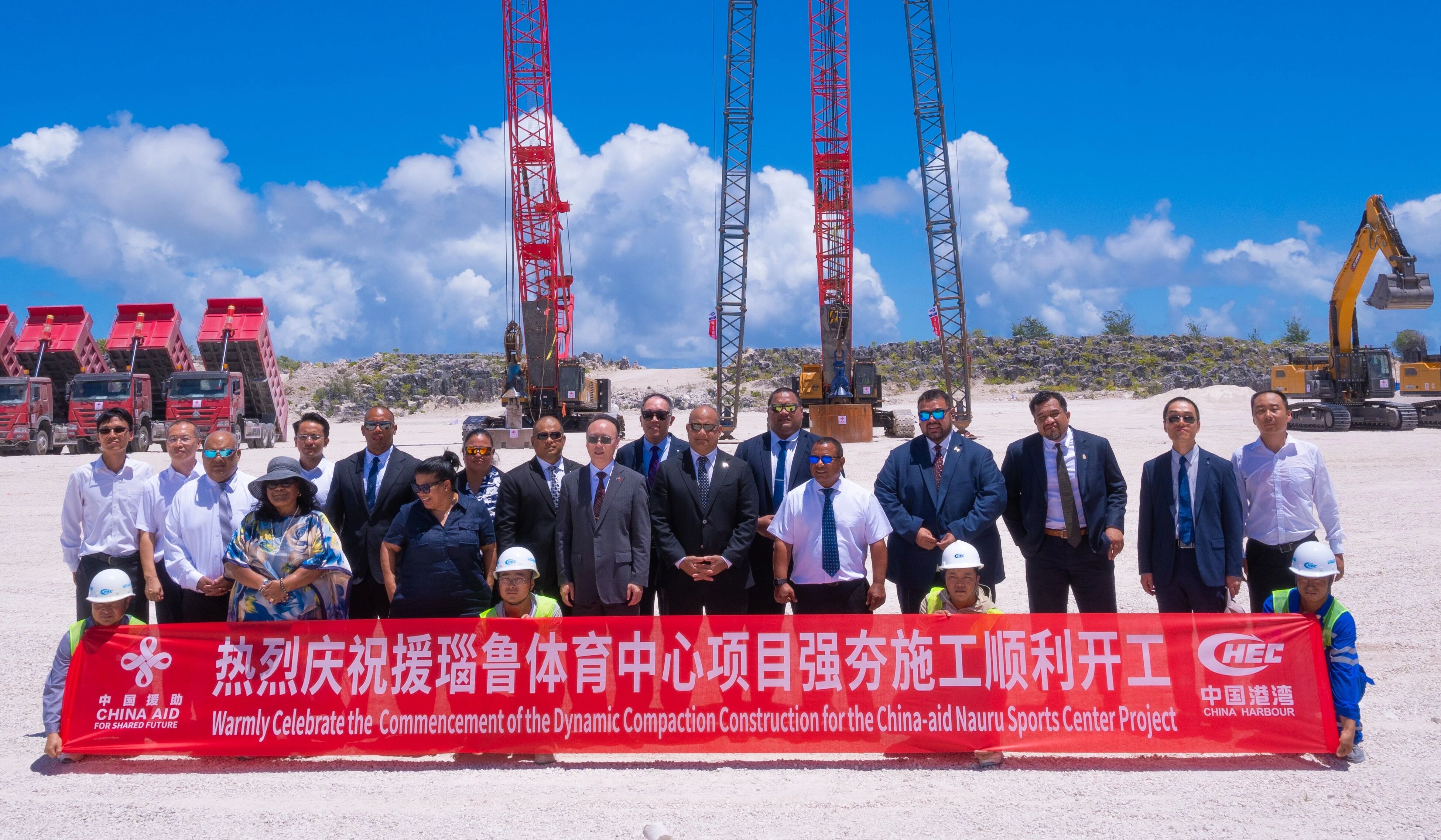 近日,由中国政府援建、中国港湾承建的援瑙鲁体育中心项目强夯施工开工仪式在瑙鲁梅能区举行。瑙鲁总统阿迪昂、议长兼奥委会主席斯蒂芬,中国驻瑙鲁大使吕进出席开工仪式。