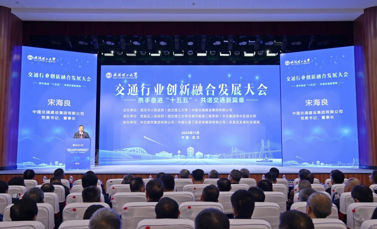 11月8日,由武汉市人民政府、武汉理工大学、中交集团共同举办的交通行业创新融合发展大会在武汉理工大学举行。交通运输部原副部长何建中出席大会。中交集团党委书记、董事长宋海良出席大会并致辞。武汉理工大学党委书记孟芳兵主持大会。