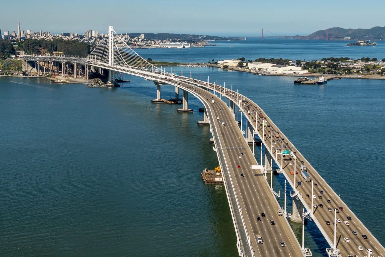 美国旧金山—奥克兰海湾大桥始建于1933年,是旧金山市对外的交通咽喉,该桥分东、西两段。因东段在1989年地震中受损严重,加州交通厅于1998年决定重建。振华重工最终成为大桥主体45000吨钢结构的承建单位,并于2011年提前完工交付。新海湾大桥主跨565米,落成时是全球最大跨度的单塔自锚式悬索桥;钢塔高160米,为世界抗震钢塔第一高;桥面钢箱梁为世界同类桥梁中第一大钢箱梁,桥面总宽可容纳双向12车道,是世界单塔桥梁之首。项目全部钢结构皆通过了全球顶尖的“相控阵技术检查”,振华重工成为“国内首家通过相控阵技术检查的大桥钢构高精尖焊接”企业。