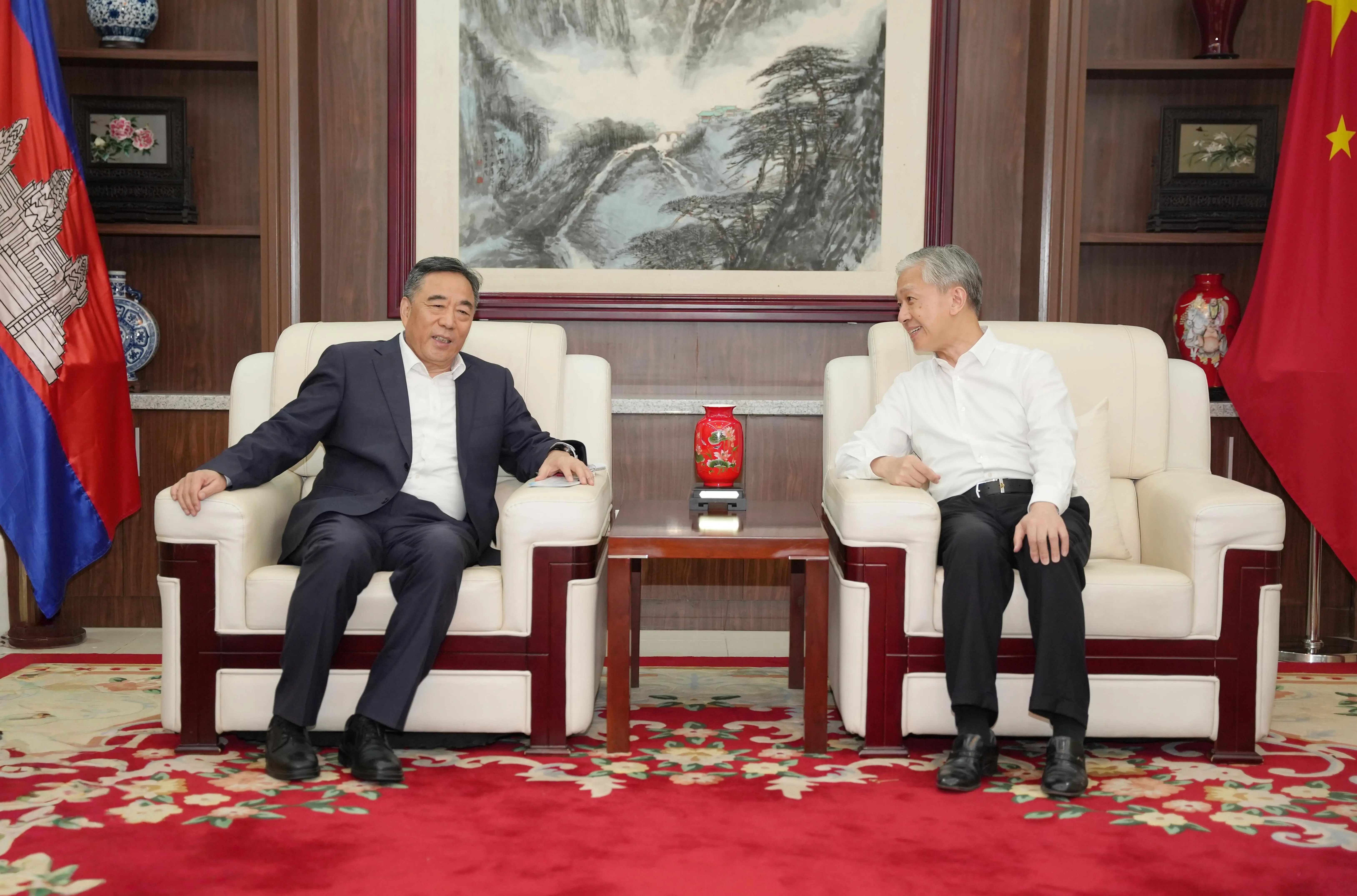 汪文斌对宋海良一行到访表示热烈欢迎,对中交集团25年来深耕柬埔寨市场、为当地发展作出的突出贡献给予高度肯定。他表示,中国与柬埔寨是风雨同舟、休戚与共的“铁杆”兄弟,近年来在两国领导人的战略引领下,双边各领域合作呈现蓬勃发展、多点突破的良好态势。中交集团作为全球基础设施和城市建设领域的领军企业,凭借雄厚技术实力、丰富建设经验和高效履约能力,在柬投资建设了一系列重点项目,受到柬埔寨政府和社会各界的广泛赞誉。希望中交集团继续发挥全产业链优势,深度融入柬埔寨国家发展大局,以扶南德佐综合水利工程等重大项目建设为牵引,在基础设施互联互通、数字基建赋能、绿色低碳转型、民生保障提质等领域拓展新合作、打造新标杆,推动中柬务实合作迭代升级,为巩固深化新时代全天候中柬命运共同体作出更大贡献。