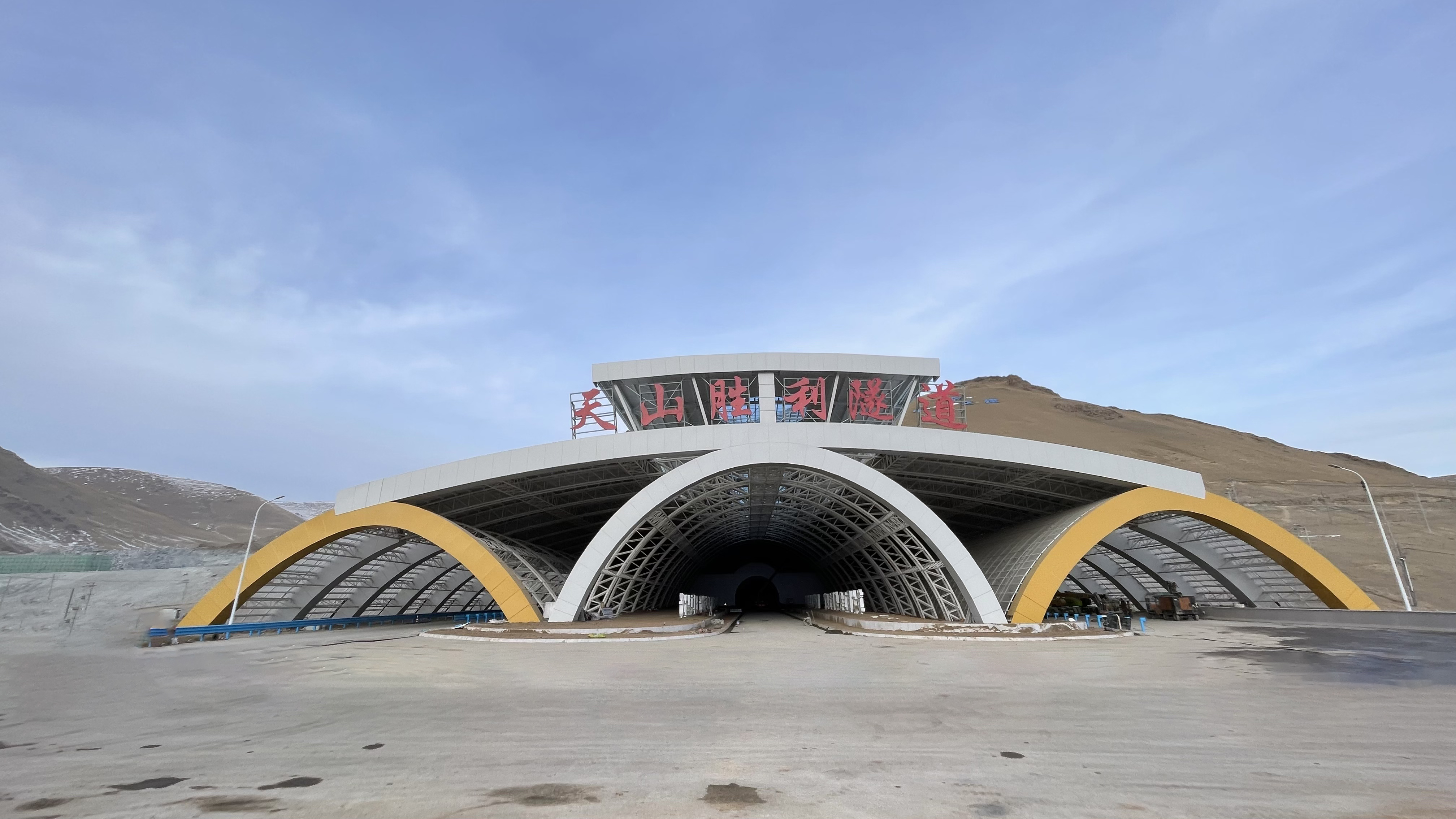 作为隧道出口的标志性设施,该棚洞匠心独运,以“天、地、人”为核心设计理念,将文化内涵与建筑美学深度融合。“天山、雪莲、蓝色湖泊”等新疆地域元素点缀其间,在细节处尽显西域风情。功能与结构上,棚洞兼具多重实用价值,既能缓解隧道内外光照差、减少司乘眩光以保障行车安全,又可抵御雨雪侵袭、降低环境噪音,提升通行舒适度。棚洞用坚固钢桁架结构,棚体投影面积超9321㎡,基础采用“摩擦桩+承台”组合形式,上部钢结构通过高强度地脚螺栓与基础精准衔接,安装中采用斜垫调平工艺,确保整体结构稳固可靠。
