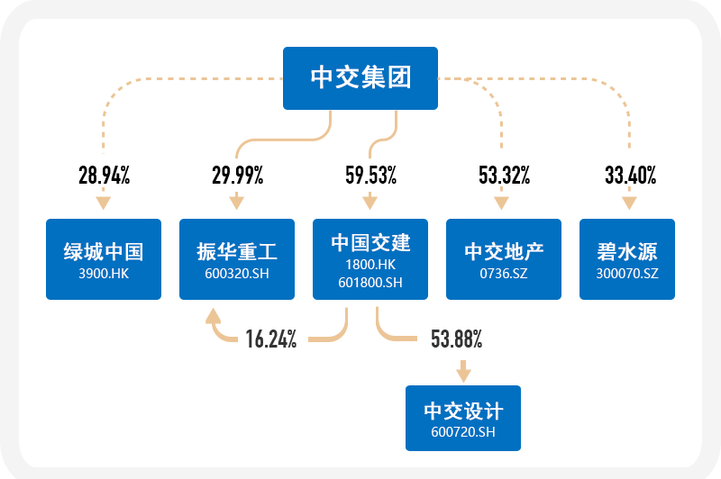 - 2019年11月5日,中交集团以持有的7,282.36万股A股股份换购基金产品(IPO前取得的已解禁股份),通过大宗交易换购易方达基金管理有限公司、富国基金管理有限公司和汇添富基金管理股份有限公司旗下基金产品(简称国企一带一路ETF基金)。换购完成后,中交集团共计持有约93.75亿股(含中交集团非公开发行2017年可交换公司债券质押专户股份),占总股本的57.96%;A股股东持有约为23.73亿股,占总股本的14.67%;H股股东持有44.275亿股,占总股本的27.37%。