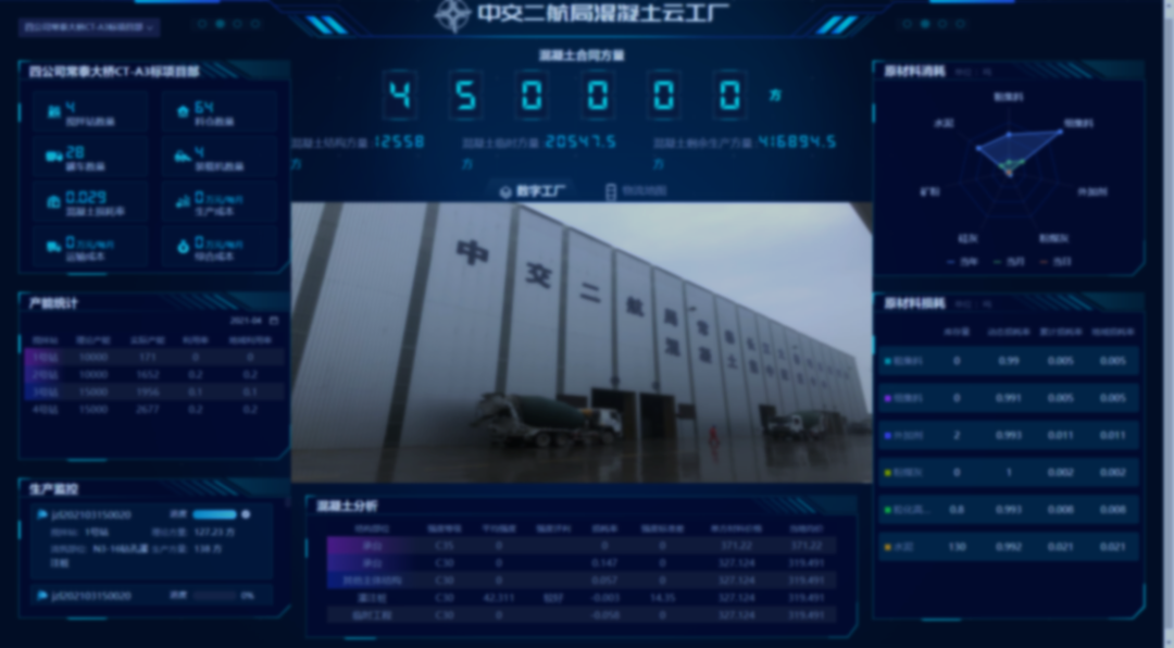 中交二航局打造国内首个混凝土生产全过程质量监控系统—“混凝土云工厂”,实现混凝土从原材料进场、检验、生产到运输全过程精细化管理,同时实现混凝土最佳配合比,提高生产效能和质量,降低生产成本。已在平陆运河、沁伊高速、常泰长江大桥等400个项目上应用,实现了混凝土质量100%合格,现场人员减少30%的目标。