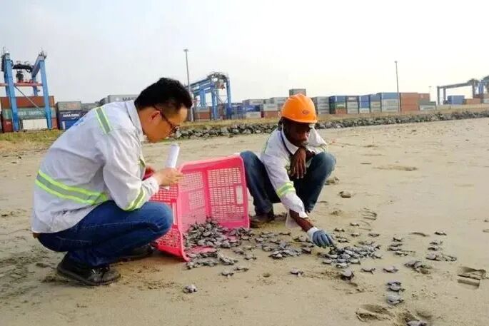 中交集团在加纳特马港项目附近建立“海龟孕育中心”,聘请当地专家组建专业队伍,累计孵化放生小海龟1.7万余只。